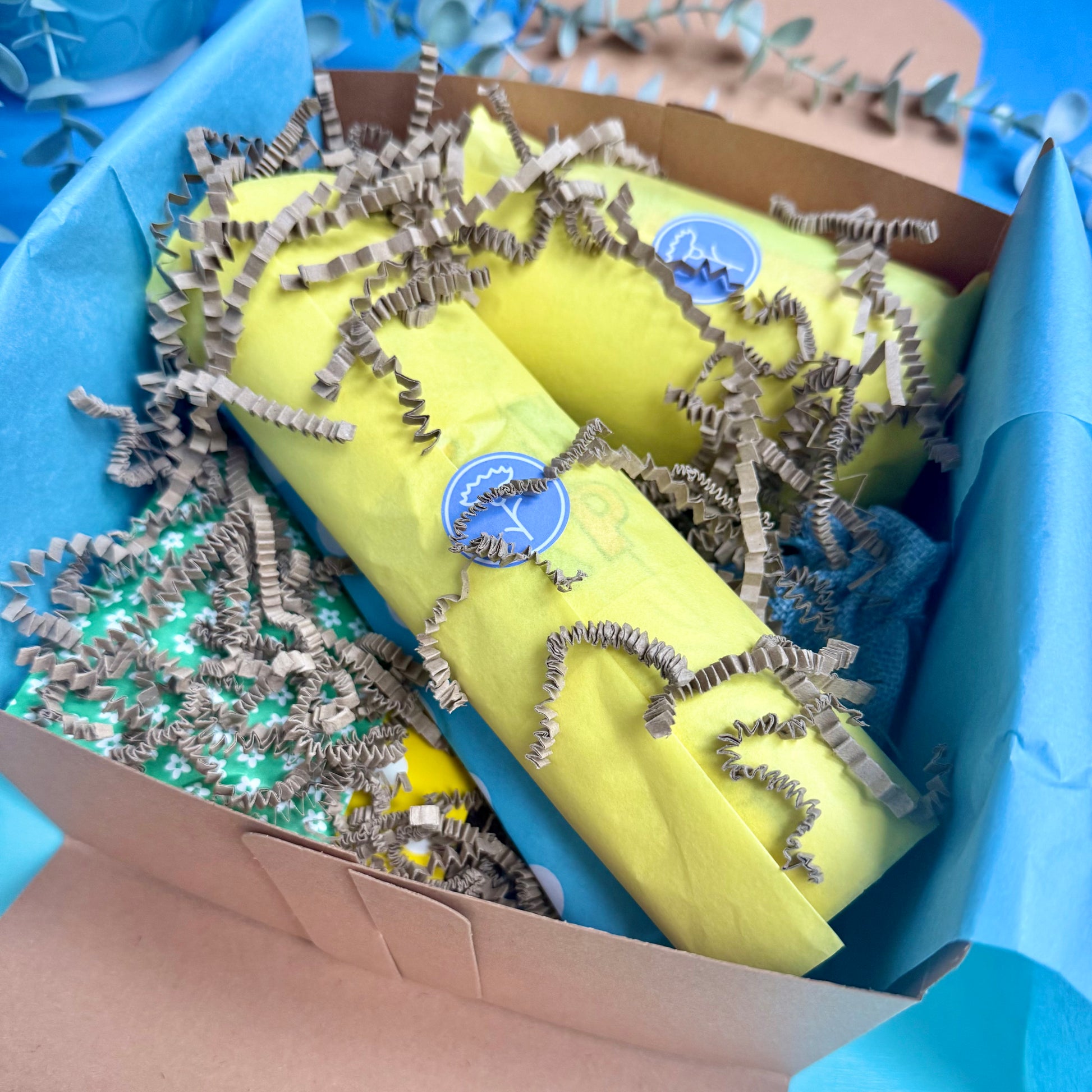 All items are thoughtfully packed by hand in a kraft box with tissue and ribbon.